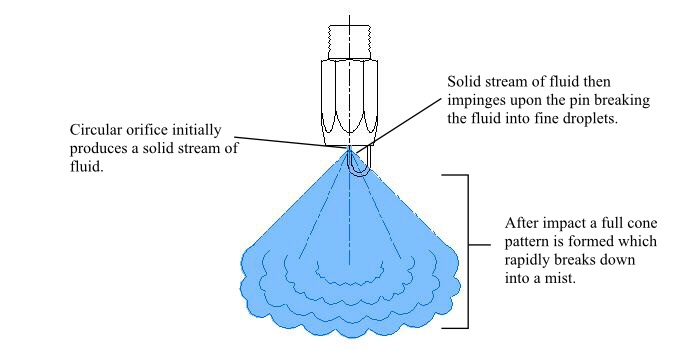 With this design of nozzle, the fluid is ejected from the nozzle orifice and impacts upon a pin in the direct path of the water flow. This breaks up and disrupts the flow into a fine spray cone. As the fluid is being broken up by impact, different from being forced through a very small orifice, this allows for a larger orifice than other misting nozzle designs, thus allowing for more viscous water to be sprayed into a mist pattern. This is especially effective in special effects, water parks, Landscaping applications.