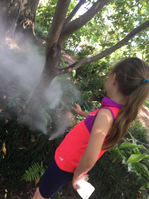 • Misting placed high in trees for a fogging effect emanating from the tree. To accomplish this look, a tree of medium height say around 35 feet can have 5 to 10 mist nozzles placed into its canopy creating a magical fog. With addition of low voltage lighting and a timer the effect could be very dramatic and quite the crowd pleaser at parties and other functions.